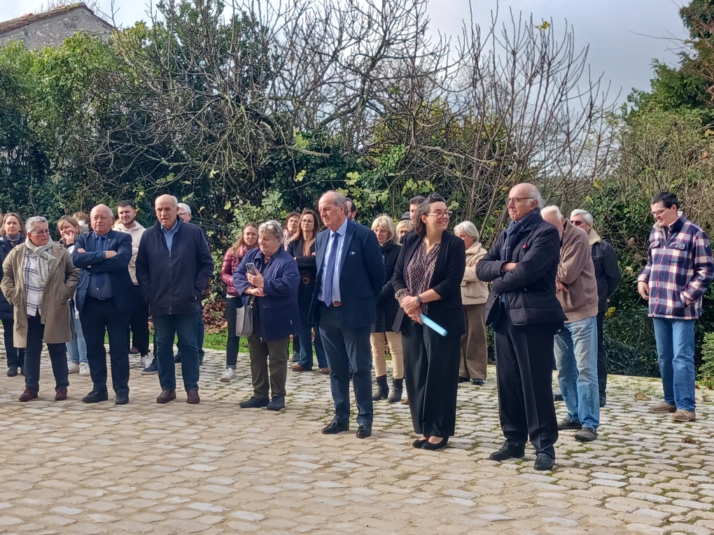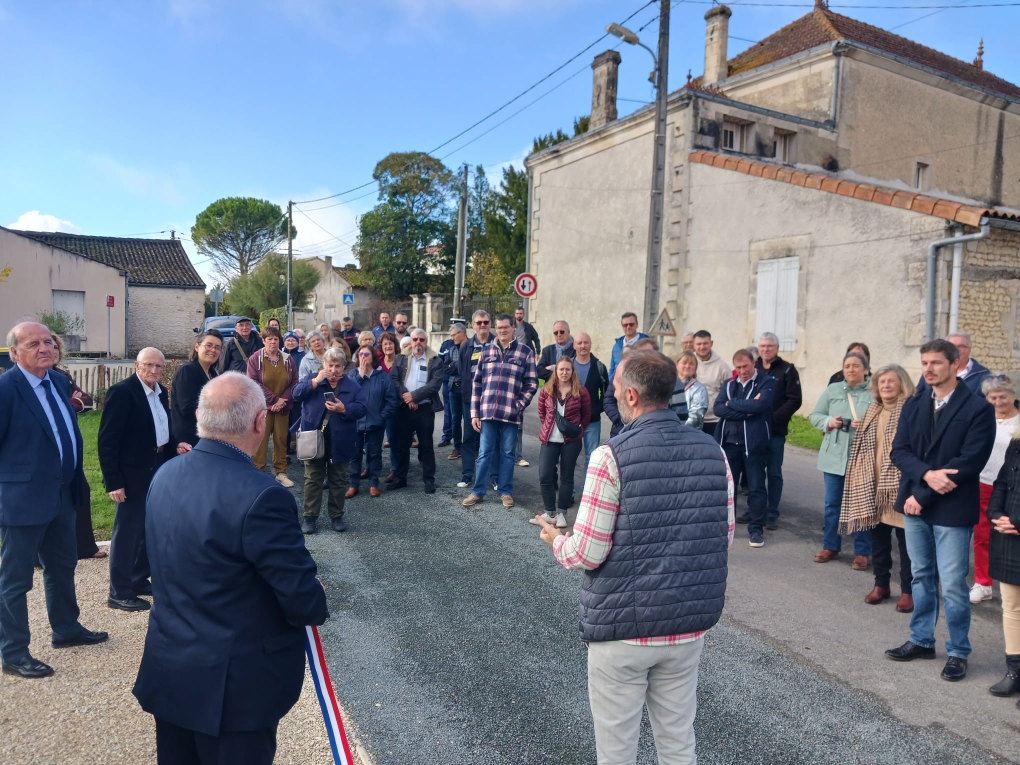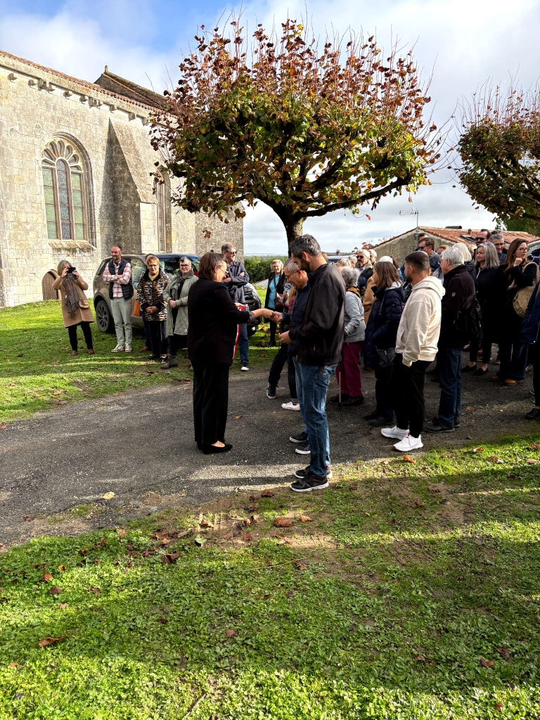 Avec l’aide du Département de la Charente-Maritime, le parvis de notre église et la petite place au centre de Meussac ont fait peau neuve en 2025. Le Maire et le Conseil Municipal ont souhaité organiser une petite cérémonie d’inauguration. Les Echebrunois ont été cordialement invités à se rassembler le samedi 8 novembre à 11 heures devant l’église. 75 personnes étaient au rendez-vous, dont plusieurs invités d’honneur : Hélène Lemesle, Sous-Préfète de Jonzac, Daniel Laurent, Sénateur, Jacky Botton, Conseiller départemental et maire de Pons, ainsi que les maires de Coulonges, Biron, Pérignac et Jarnac Champagne. A l’approche du parvis de l’église et ensuite devant la place de Meussac, coupure du ruban par la Sous-Préfète, explications du maître d’oeuvre et discours. Après les cérémonies, les participants ont passé un moment convivial à la salle des fêtes.